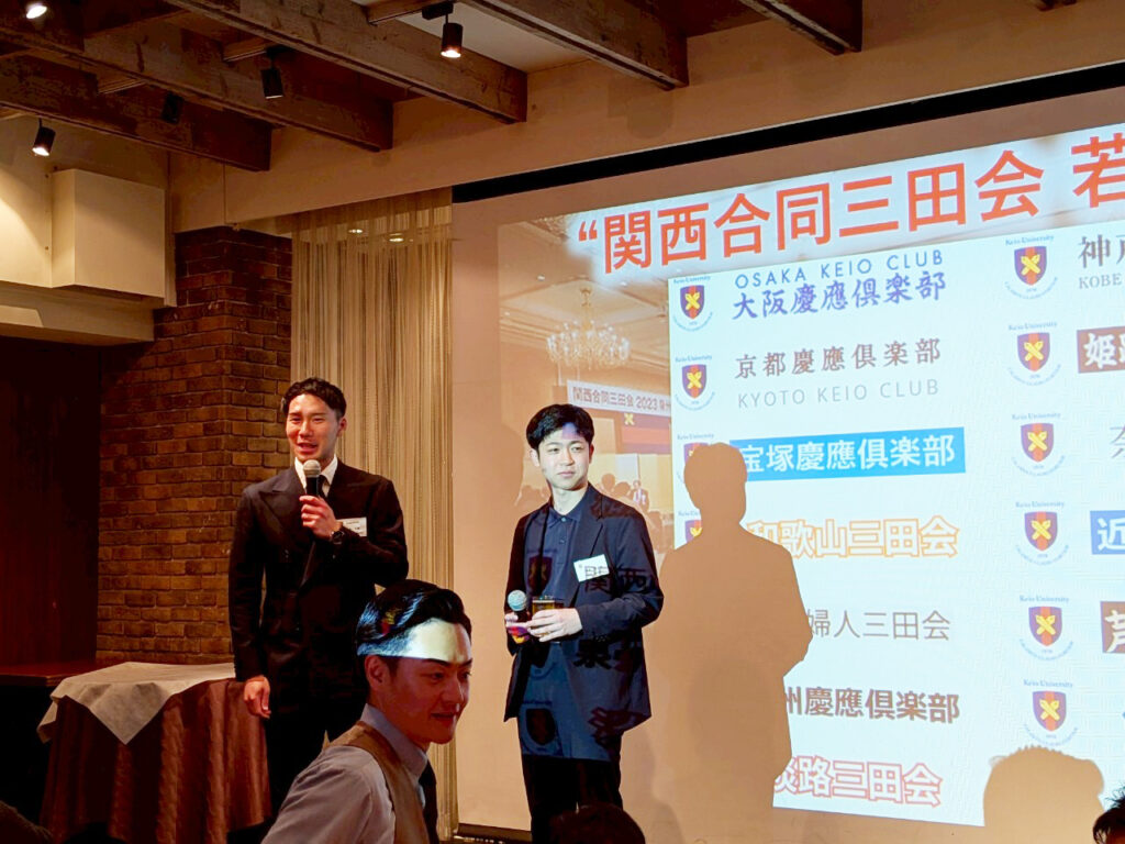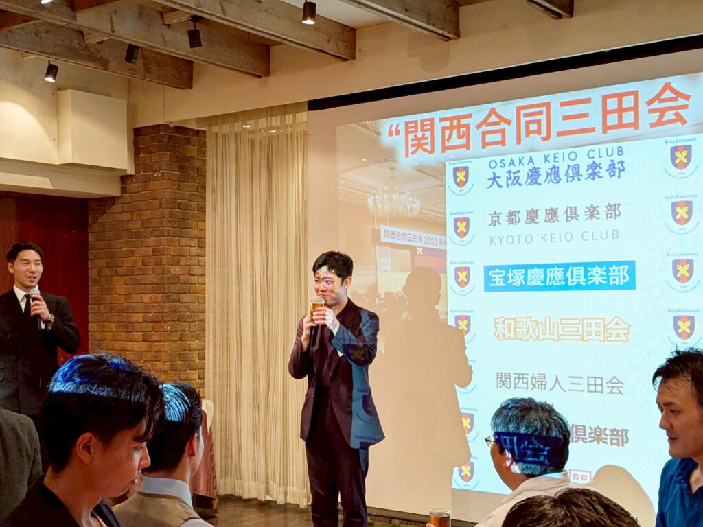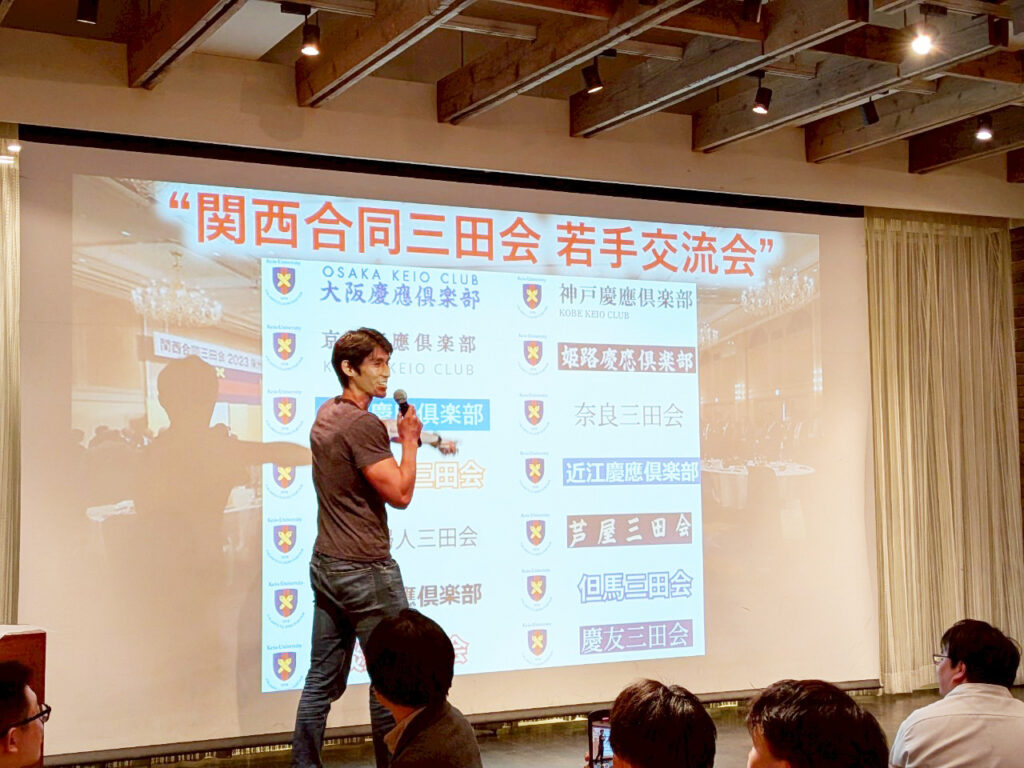 当日は、司会を平成31年卒の河合氏が務め、冒頭の挨拶では、関西合同三田会を代表して平成23年卒の金岡氏が登壇。「若手のネットワークがこれからの三田会の未来をつくる」と力強く語り、会の開幕にふさわしい熱のこもったメッセージを届けました。